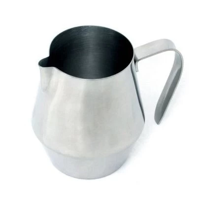 This 10 oz. tapered side steaming pitcher is made of 18/8 gauge high quality stainless steel with a narrow pour spout. A standard steam/frothing pitcher in the commercial espresso industry. Since steaming milk is best when you steam as needed, this pitcher is perfect for the espresso station that serves one drink at a time. Height of pitcher is 3 1/16″.