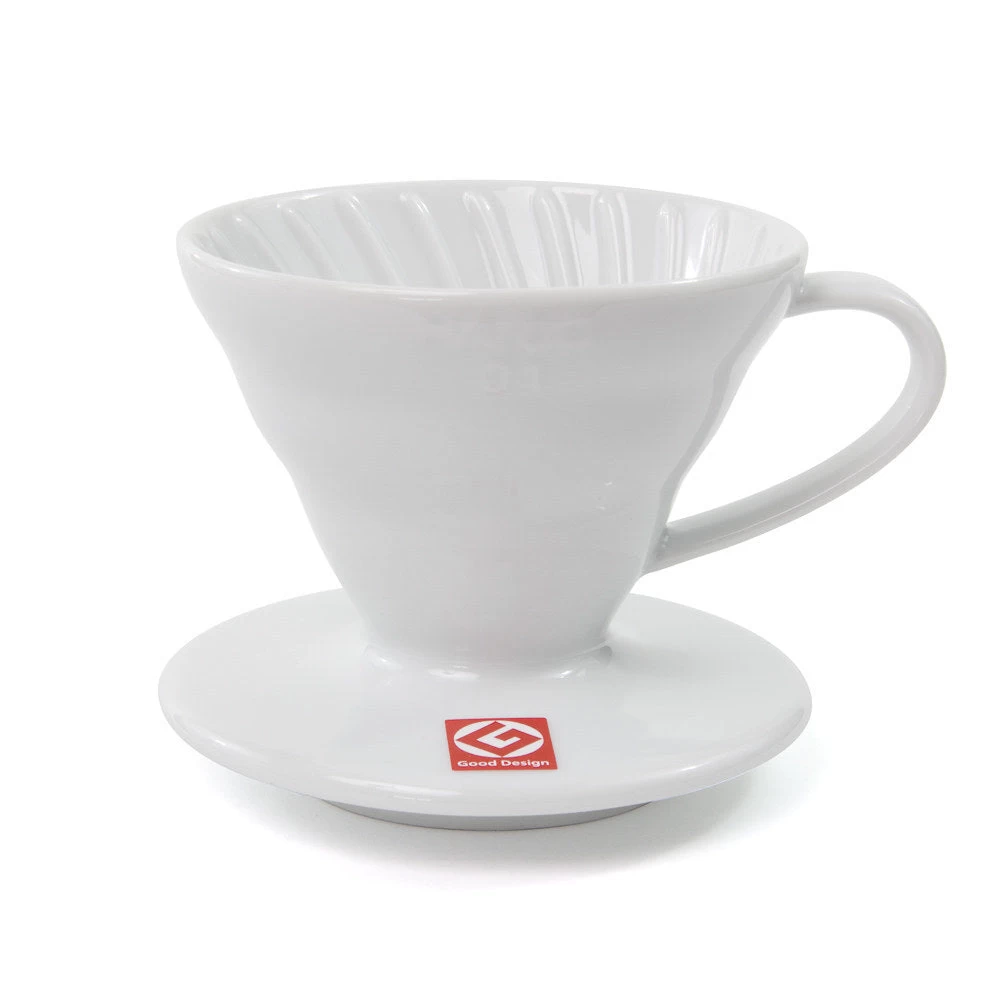 This ceramic dripper is handmade in Japan and brews up to 2 cups. The cone increases the depth of the coffee bed, which helps with extraction while the extraction speed is controlled by the user. The V60’s conical shape allows for deeper layering of coffee grounds, and its spiral ridges and lack of flow restriction allow the user to pour the water quickly for a delicate body or slowly for a heavier flavor.Â