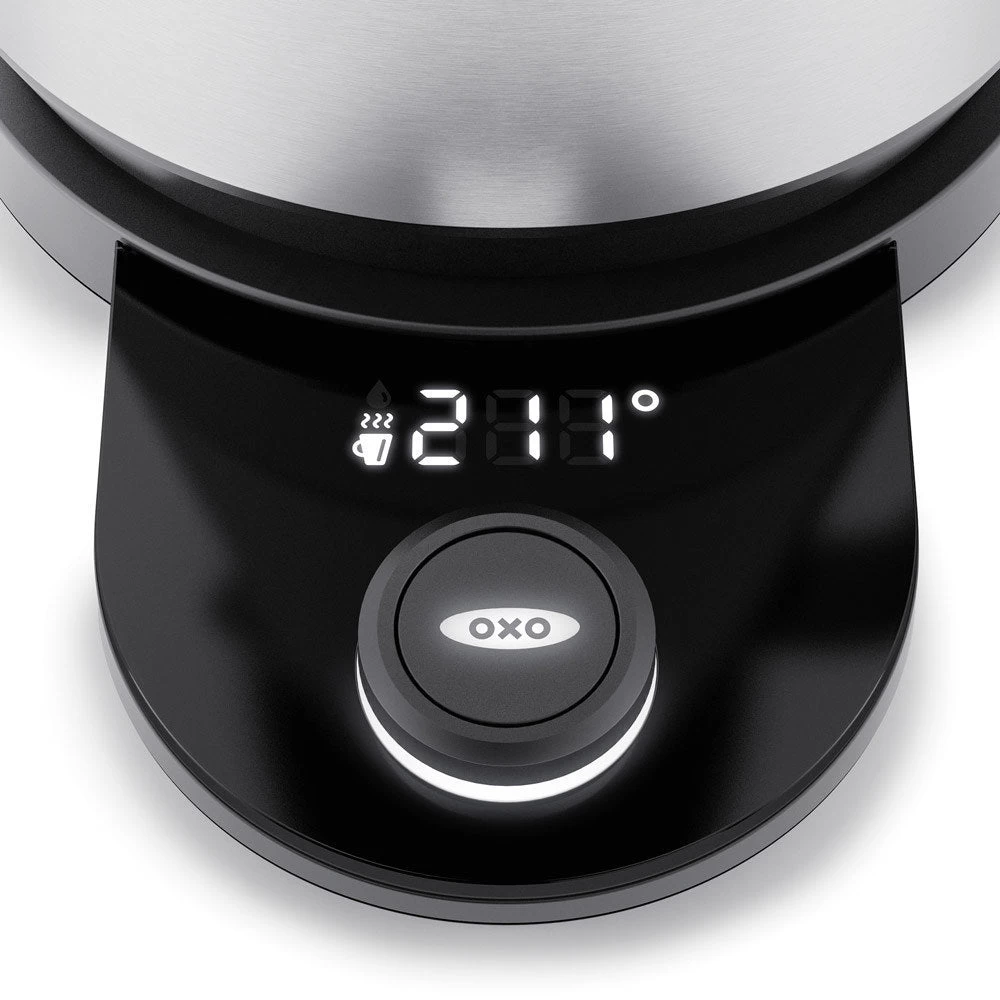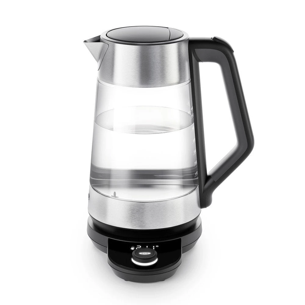 With the OXO Brew Adjustable Temperature Kettle, you can select the precise temperature for your tea or coffee with a simple twist of a knob. Choose any temperature between 170 and 212°F, and the water is heated and held at your preferred temperature for up to 30 minutes. The Kettle is cordless when removed from the base, with a silicone base so you can bring it to the table without worrying about damaging surfaces. The crystal-clear, BPA-free borosilicate glass ensures a pure, clean taste.