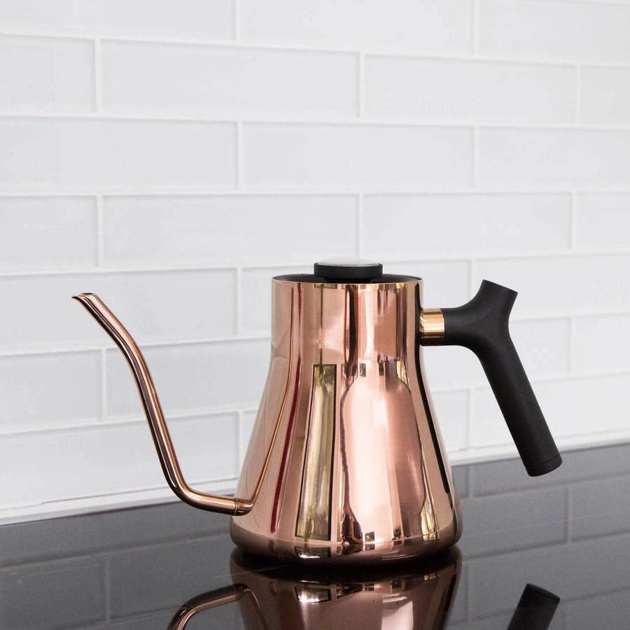The Pour-Over Kettle has a beautifully functional design that kicks your brewing up a notch. Enjoy an intuitive, steady pour with the precision pour spout and keep track of temperature brews with a built-in brew-range thermometer. The counterbalanced handle moves the center of mass back towards your hand so you can pour at an even and slow pace, the Barista technique for perfecting the bloom and an even extraction when it comes to pour over coffee brews.